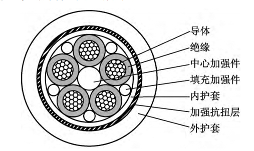 2.為了加強整根電纜結構強度,保證電纜的耐用性,采用了中心加強件。中心加強件由芳綸紗以及芳綸紗外部擠包成型的輻照型乙丙橡膠層組成。為了將各纜芯分隔開提高絕緣效果,同時加強結構強度提高抗拉和抗壓能力,采用了填充加強件。填充加強件采用了細萱麻繩,其在實現以上目的的同時,也不會過多增加電纜的重量。